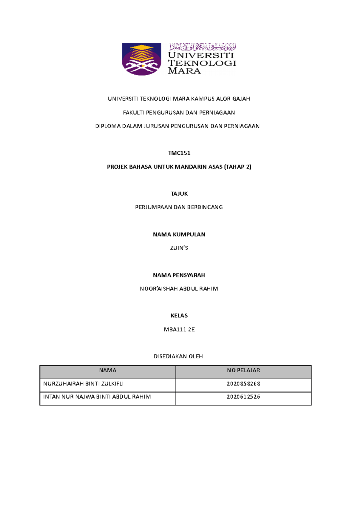 Template Projek Bahasa Mandarin Level 2 Universiti Teknologi Mara Kampus Alor Gajah Fakulti Studocu