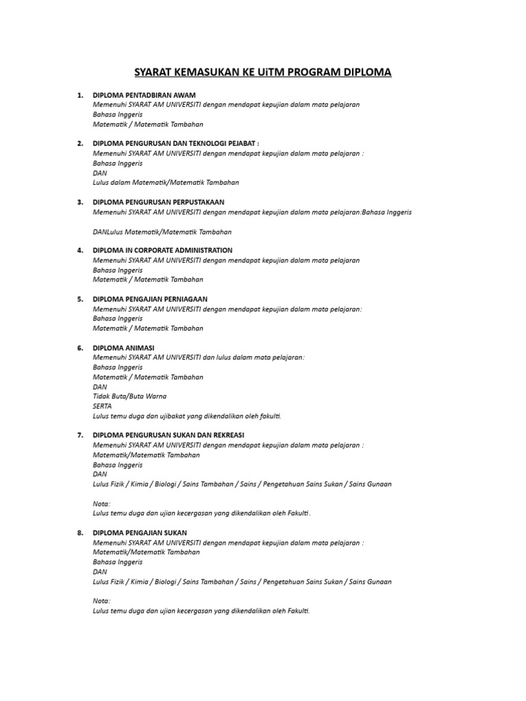 Syarat Kemasukan Ke Uitm Program Diploma Pdf