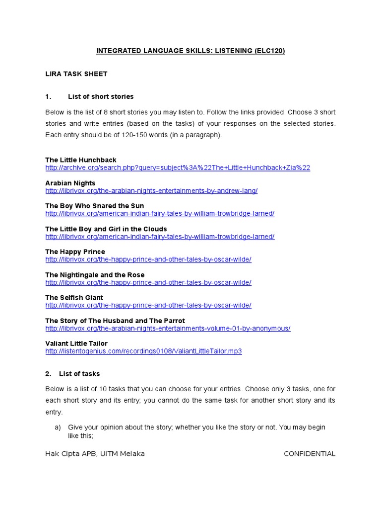 Lira Test Pdf Elc 121 Integrated Language Skills I Listen U2013 Interact U2013 Reflect Lira Title Of The Story The Happy Prince Name Aleya Shafina Binti Course Hero