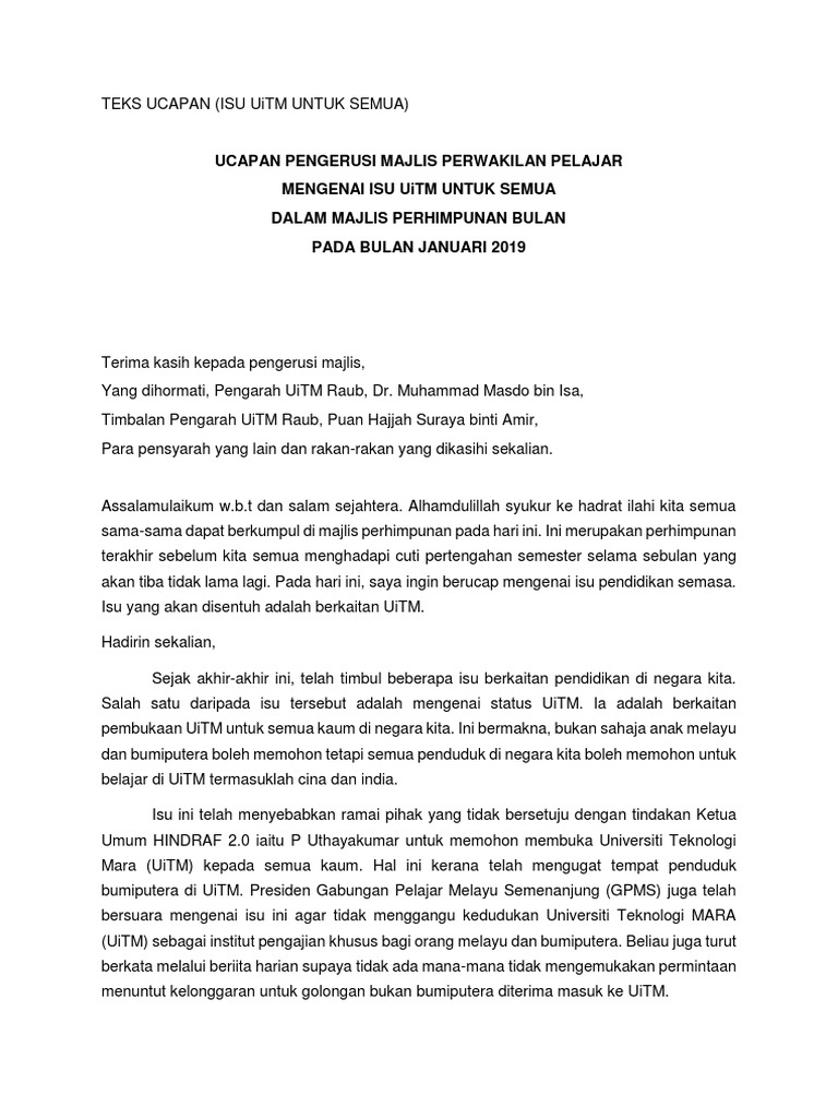 Sebagai seorang pelajar di institusi pengajian tinggi khusus untuk masyarakat Melayu dan Bumiputera seperti UiTM ini haruslah sedar pentingnya kita membina dan mempertahankan budaya asli kita. Jom kita lihat antara idea-idea yang beliau ketengahkan khas untuk para pelajar universiti. Khuzairi Ismail Wartawan Utusan sebahagian daripada kira-kira 5000 orang pelajar UiTM berarak dengan memegang sepanduk membantah cadangan supaya institusi itu dibuka kepada bukan bumiputera di Shah Alam Selangor semalam.